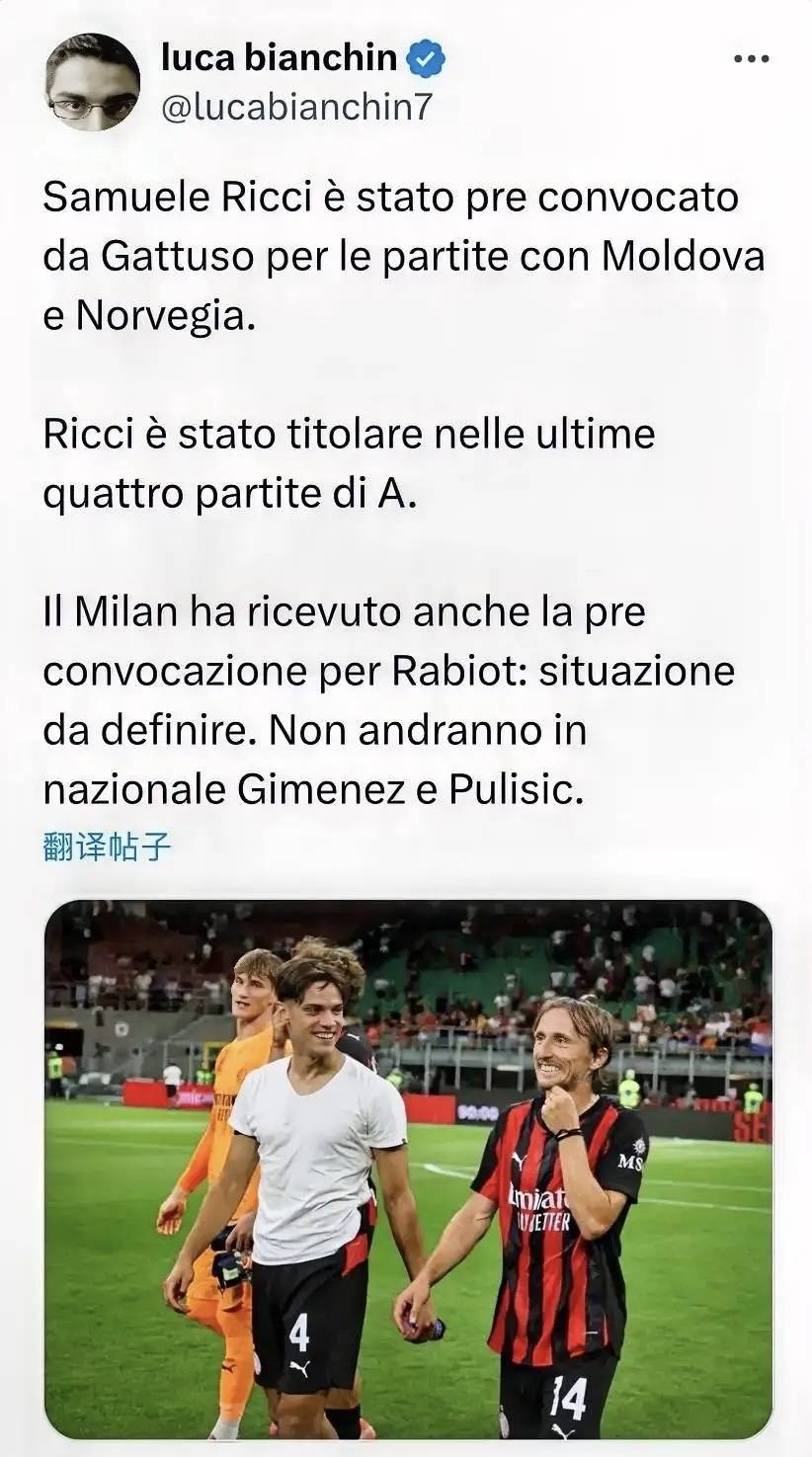 有消息说米兰俱乐部同样得知了里奇入选意大利国家队的消息。但俱乐部内部比较平静,大家并没有过多关注里奇本次入选意大利国家队,其实想想也能理解,上个国家队比赛日,米兰内洛除了伤员就没人了,大家都是各自国家队的国脚,对今天的意大利国家队实在是无感,毕竟意大利国家队已经不是十几年前的意大利国家队,意大利足协在不做出调整,意大利国家队就要变为欧洲二流了。